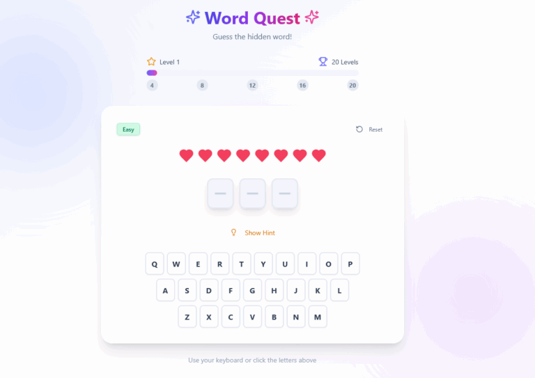 WordQuest is a thrilling word search adventure that will test your vocabulary and speed. With 20 challenging levels, you’ll hunt for hidden words, race against the clock, and sharpen your mind with every puzzle. Can you rise to the challenge and become a true word master?